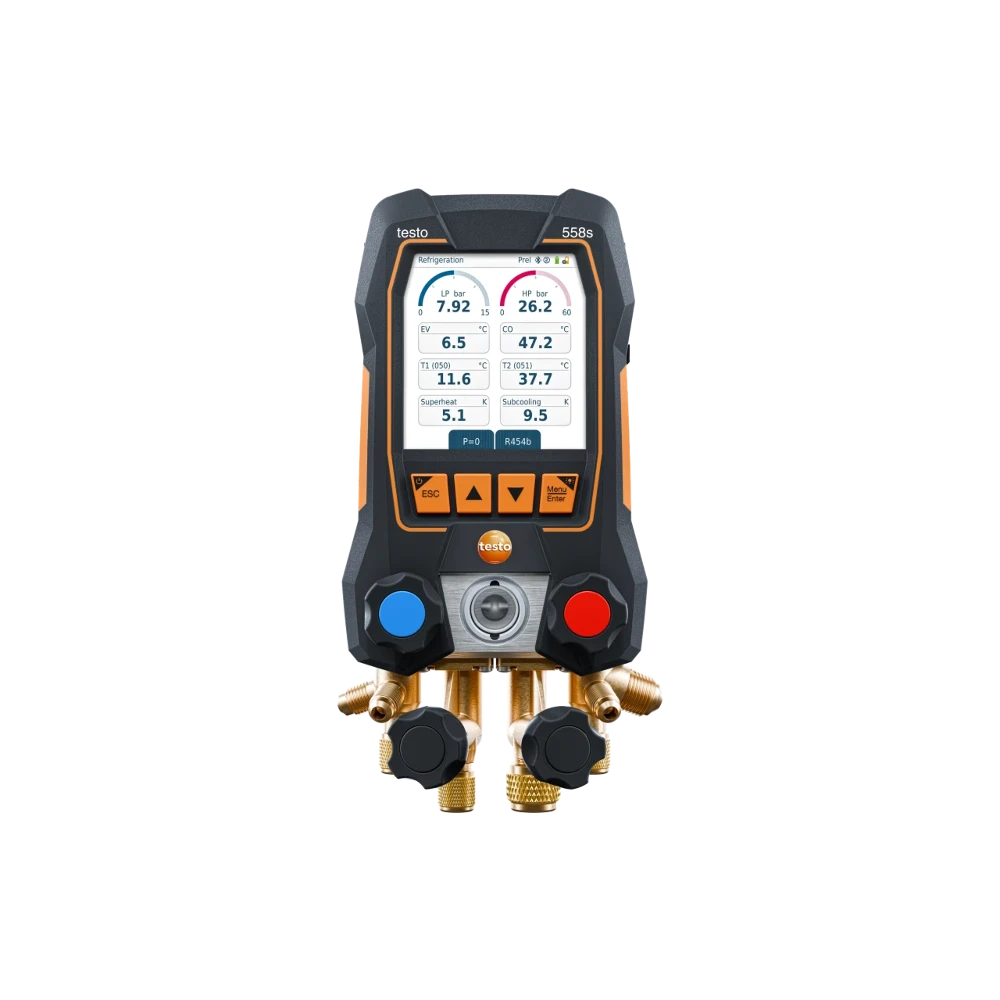 Il testo 558s include un’app intuitiva nel manifold, con touchscreen e grafici di misura di facile lettura su un ampio display a colori. Oltre al touchscreen, il manifold può essere comodamente utilizzato tramite pulsanti, permettendo un uso agevole anche con i guanti. Grazie alla compatibilità A3 e A2L, l’elevata robustezza con IP 54 e il sistema di ricarica ibrido composto da batteria ricaricabile e batterie tradizionali, il manifold si adatta perfettamente a ogni situazione.