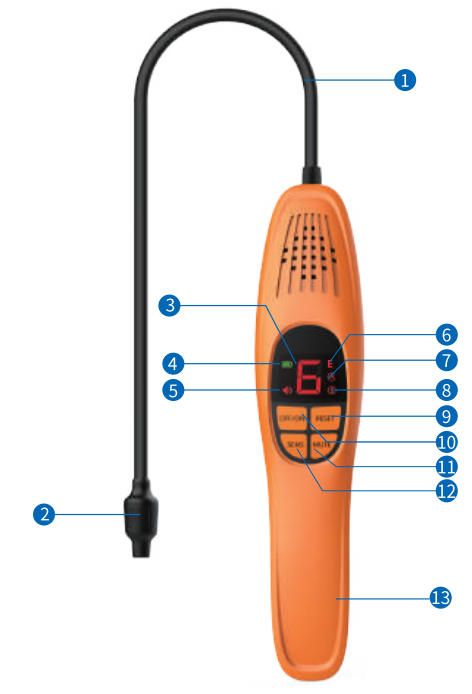 1. Sonda flessibile 2. Sensore 3. schermo di visualizzazione 4. Led del livello della batteria a tre colori 5. Led del cicalino 6. Led segnale di allarme 7. Led di ripristino automatico 8. Led sensibilità a tre colori 9. Pulsante di reset 10. Pulsante di accensione/spegnimento 11. Pulsante Muto 12. Pulsante Sensibilità 13. Base della batteria |